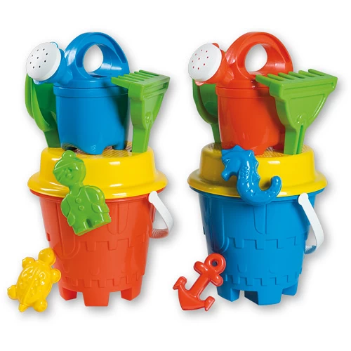 Een leuke 7-delige startset zandbakspeelgoed voor kinderen vanaf al één jaar oud. Dit zandbaksetje heeft een gieter, een harkje en schepje, twee zandvormen en een emmer met zeefdeksel. Alles bij de hand om een zandkasteel te bouwen, maar ook om de mooiste vormen te maken, modder te maken of te helpen in de tuin.