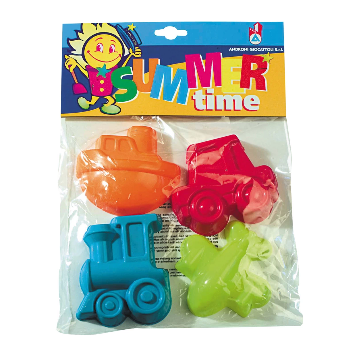 Set bestaande uit 4 voertuig-zandvormen in verschillende kleuren.