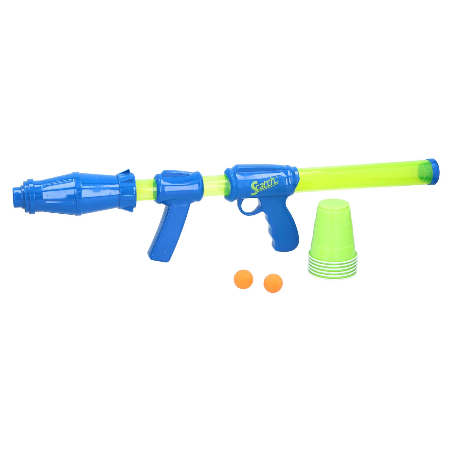 Lukt het jou om de oranje ballen van de bekers te schieten met het luchtpistool? De groen/blauwe ballenschieter knalt de oranje ballen tot wel 8 meter ver! Je kunt meerdere ballen achter elkaar schieten. De loop van het luchtpistool is 360° draaibaar voor nog meer schietpower. In de set zitten 15 oranje softballen, 6 bekers en 6 stickers. Het luchtpistool is 67,5 centimeter lang.