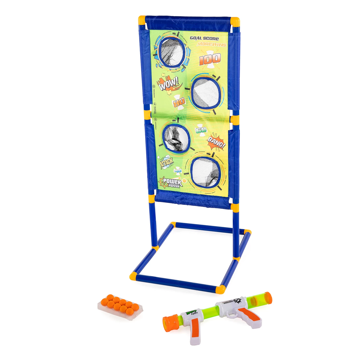 Schiet zoveel mogelijk ballen in de netjes van het doelwit met de ballenschieter! Laad de balletjes in de ballenschieter, draai het oranje uiteinde helemaal rond en je bent klaar om de balletjes af te vuren! De ballenschieter heeft een bereik van 8 meter. Maak het jezelf steeds moeilijker door verder weg te gaan staan. De set bevat een ballenschieter, doel en 10 balletjes. Geschikt vanaf 3 jaar.