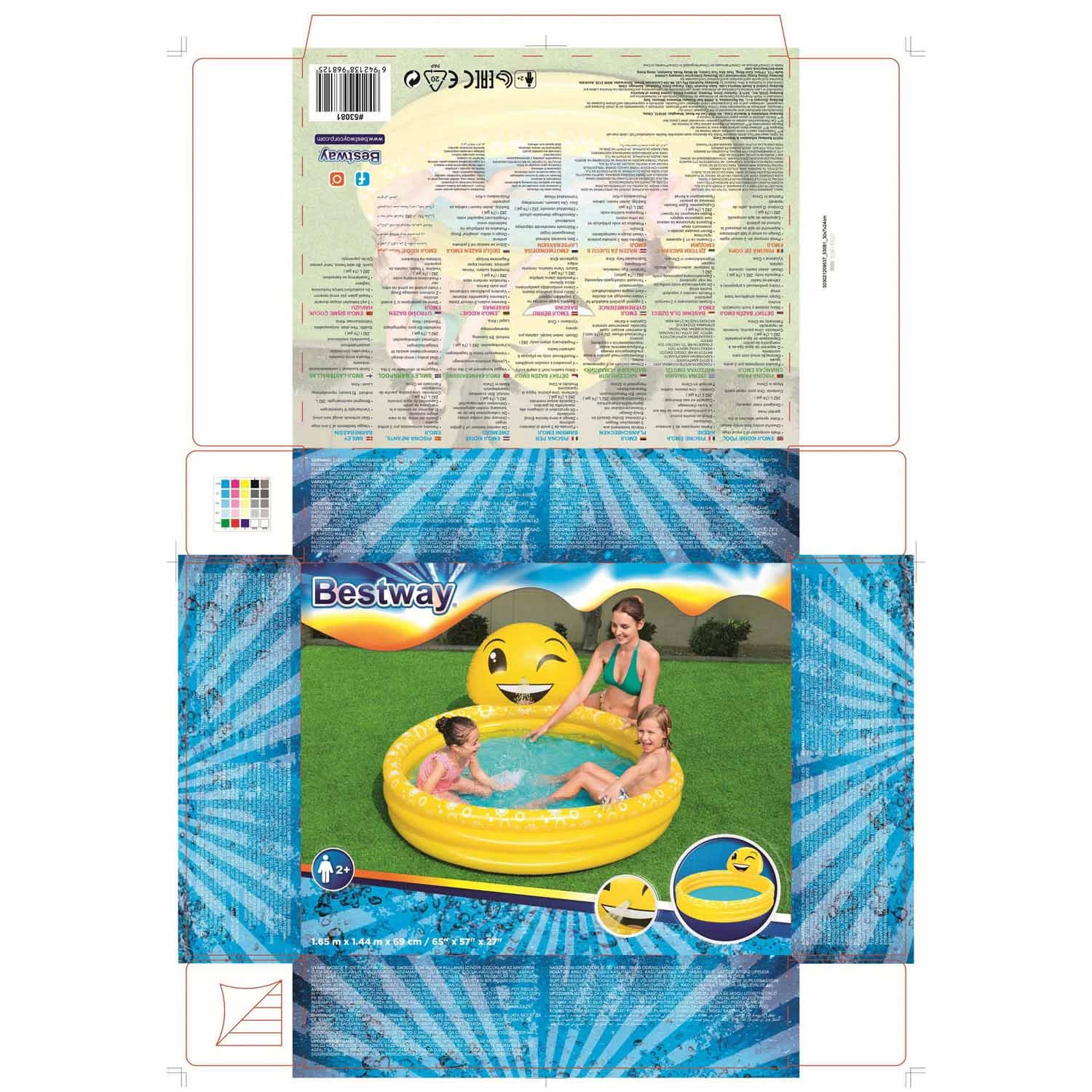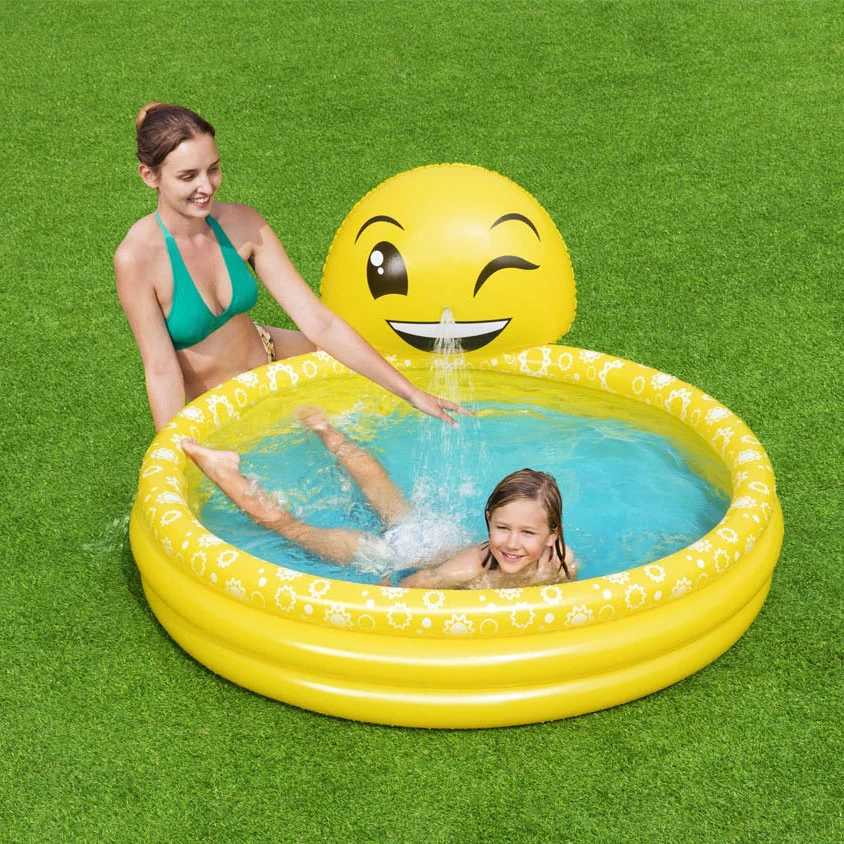 Dit vrolijke kinderbad met een knipogende smiley heeft een watercapaciteit van 282 ltr. Om te sproeien kunt u het aansluite3n op een tuinslang. Het bad heeft 3 gelijke ringen en wordt geleverd incl. reparatie patch. Leeftijd: 2+. Afmeting: 165x144x69 cm.