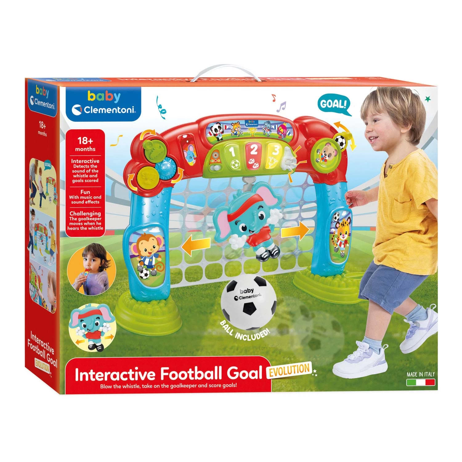 Clementoni Baby voetbaldoel, dat ook een activiteitencentrum is! Er klinkt een fluitsignaal en de doelverdediger beweegt naar rechts en naar links. Geluiden, stemmen en lichteffecten trekken de aandacht van het kind en begeleiden het kind tijdens het spelen, terwijl mechanische activiteiten het kind helpen om fijne motoriek, coördinatie en cognitieve vaardigheden te ontwikkelen. Het doel herkent het fluitsignaal dat de doelverdediger naar rechts en links doet bewegen, waardoor het scoren uitdagender wordt. Beschikt over 3 gekleurde oplichtende schakelaars die rijmpjes activeren. Met de zachte rubberen bal, geschikt voor kleine voetballers, wordt het scoren van doelpunten heel leuk! Telkens wanneer de bal het net raakt, telt het doel de doelpunten op en wordt dit gevierd met geluidseffecten. De doelverdediger kan op elk moment worden verwijderd om vrij met het voetbaldoel te spelen. Wordt inclusief 3 AA-batterijen geleverd. Geschikt voor kinderen vanaf 18 maanden.