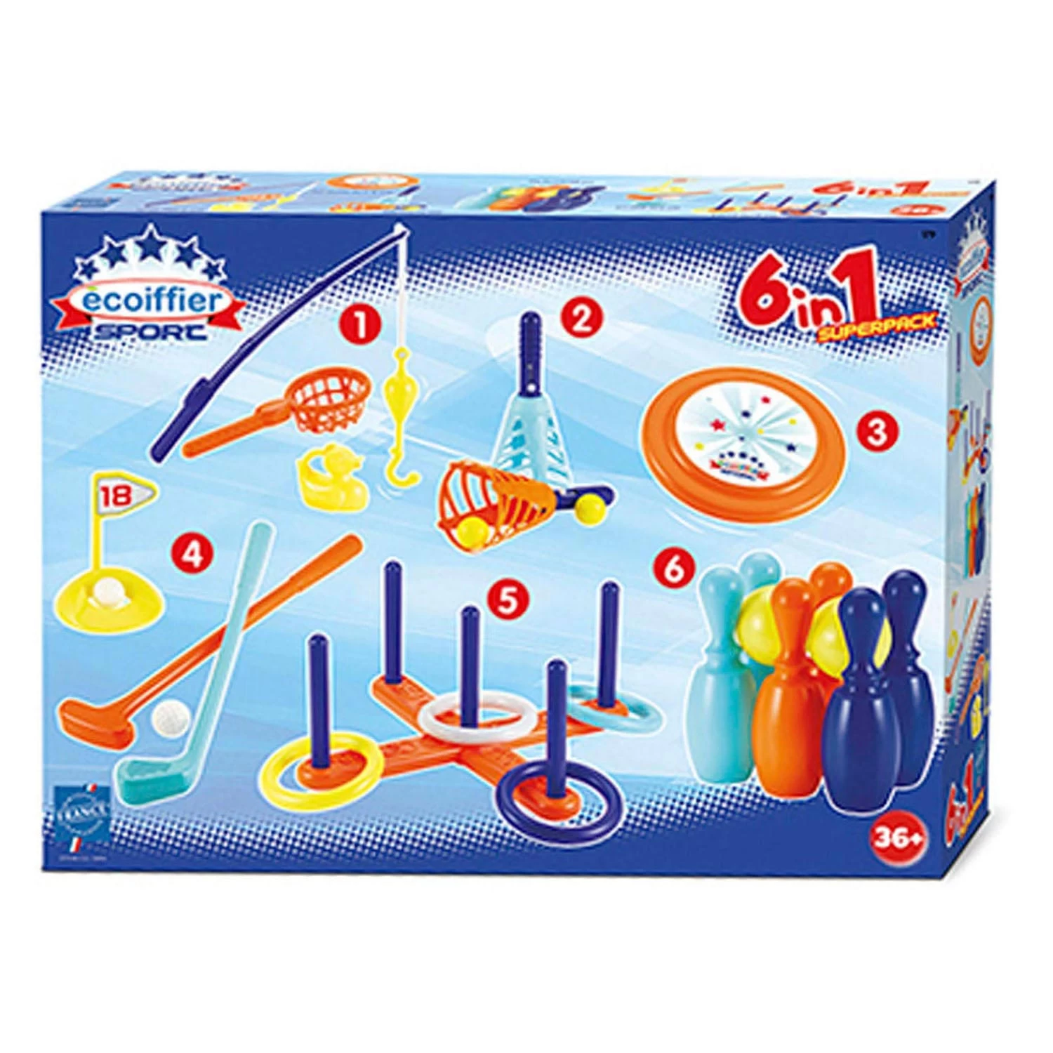 Word vaardiger terwijl je plezier hebt! Deze sportset met buitenactiviteiten bevat 6 behendigheidsspellen om te werken aan behendigheid en een gevoel van vriendschappelijke competitie, met een goed humeur natuurlijk! Deze sportset bevat: 1 eendvissenspel, 1 frisbee, 1 golfspel, 1 balwerpspel, 1 ringwerpspel en 1 bowlingspel. Geschikt voor kinderen vanaf 3 jaar oud.