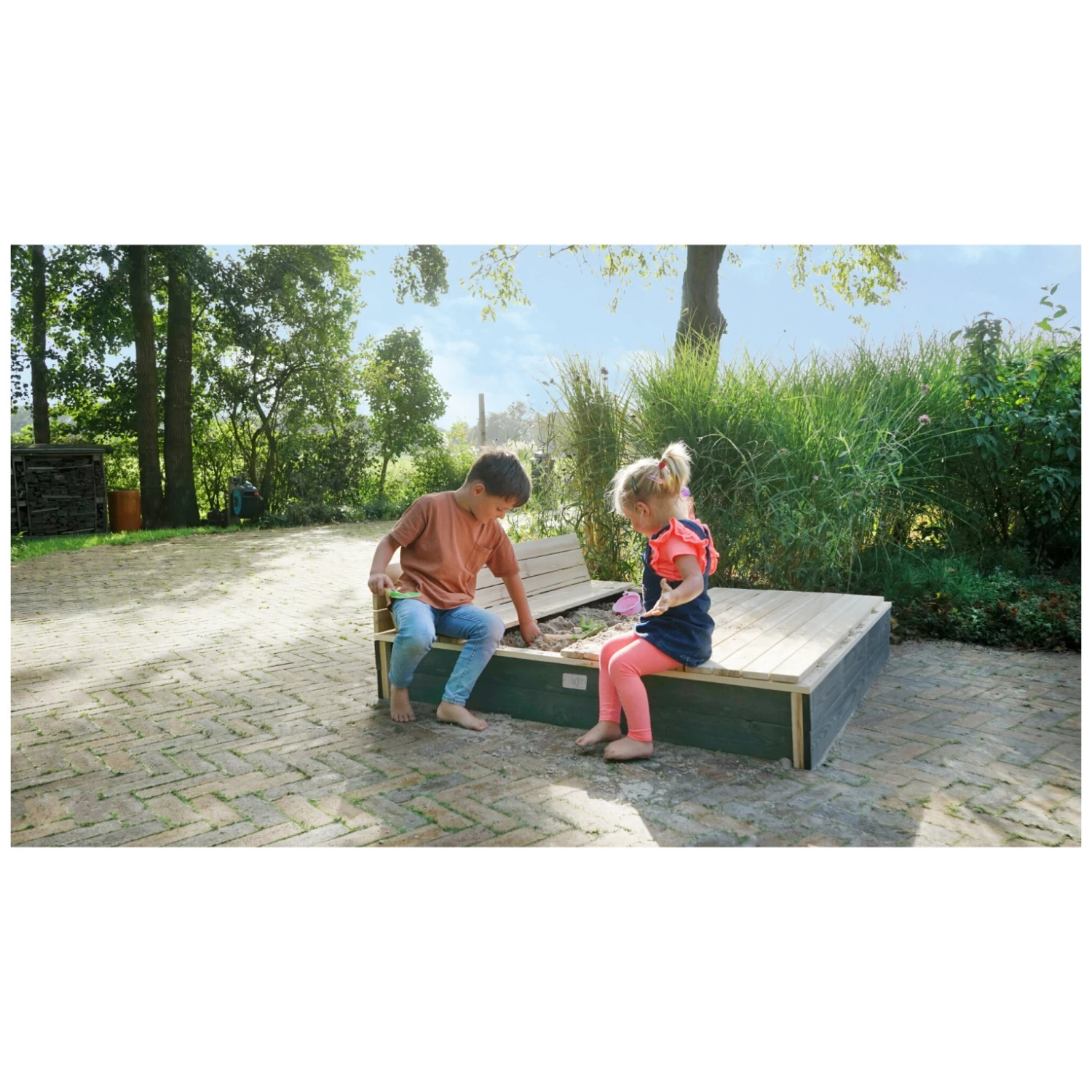 In de EXIT Aksent zandbak met bankjes kunnen kinderen de mooiste zandkastelen en zandtaartjes maken. Deze grote zandbak heeft twee stevige zitbankjes met rugleuning. En ben je klaar met spelen? Dan kun je de zitbankjes gebruiken om de zandbak volledig af te sluiten, zodat het zand in weer en wind schoon en in de zandbak blijft.