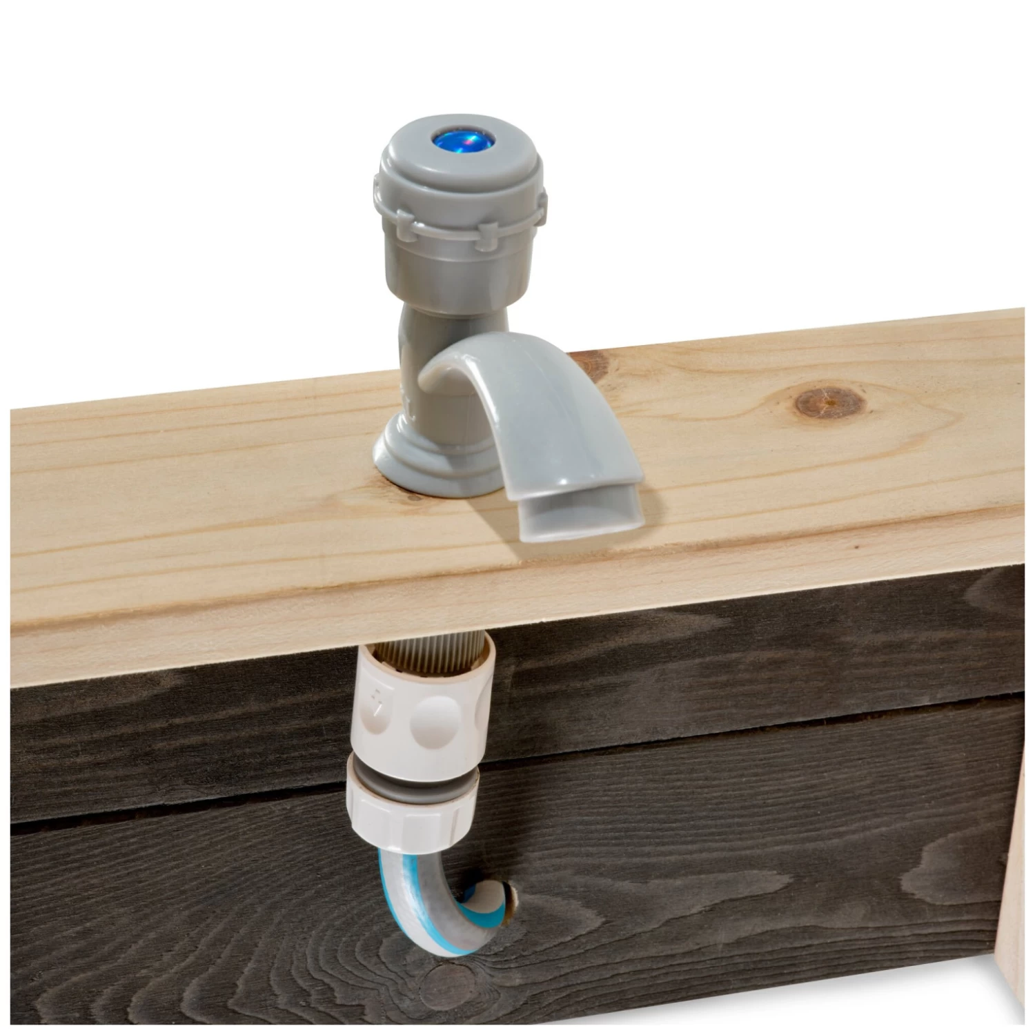 Het keukenblad heeft een fornuis met draaiknoppen en een wasbak met écht werkende kraan. De kraan functioneert wanneer je de tuinslang erop aansluit en dankzij de uitneembare wasbak is het kraanwater eenvoudig uit de wasbak te verwijderen. Onder het keukenblad zit een grote opbergruimte waar je al het speelgoed, zoals de pannen, kwijt kunt als de kinderen zijn uitgespeeld.