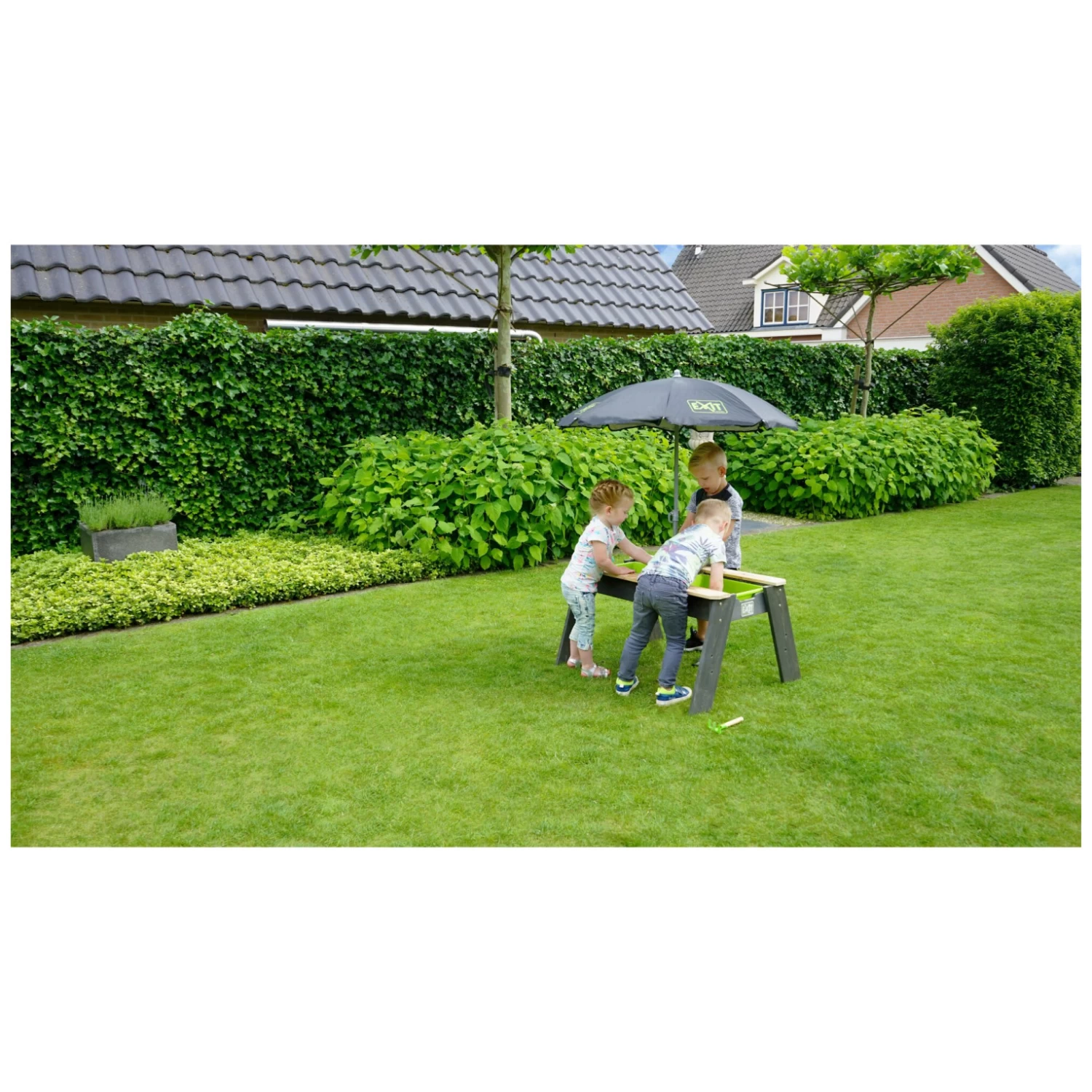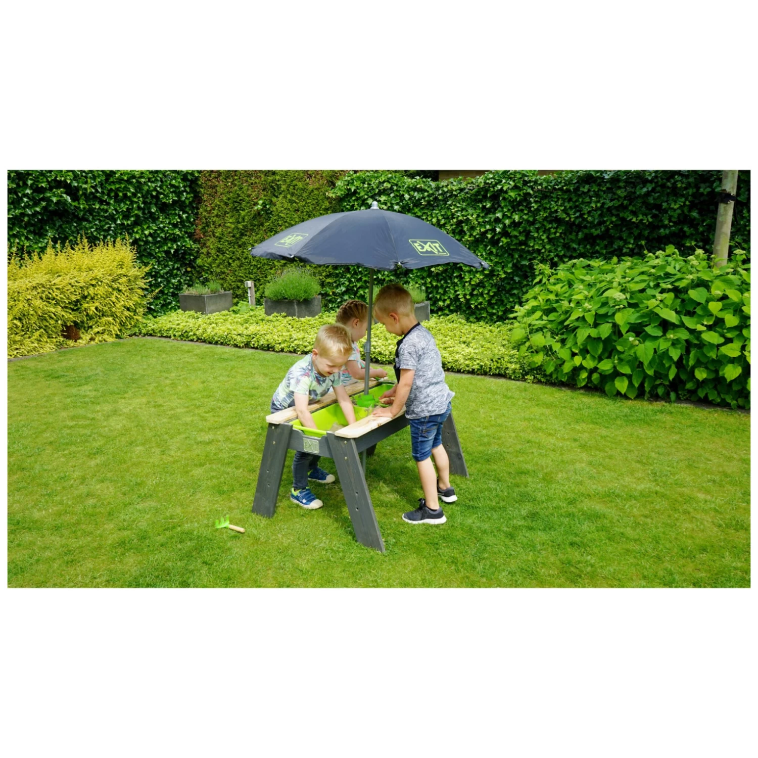 De EXIT Aksent zand- en watertafel is multifunctioneel. De zand- en watertafel heeft twee groene bakken die gevuld kunnen worden met bijvoorbeeld water of zand, maar je kunt er ook speelgoed in opbergen. De groene bakken zijn uitneembaar en dus goed schoon te maken. Bij deze zand- en watertafel worden een parasol en tuingereedschap meegeleverd. En heb je even geen zin om met zand en water te spelen? Sluit dan de tafel af met de deksel en haal je potloden of speelgoedauto?s maar op, want je kunt er ook op knutselen, bouwen en tekenen.