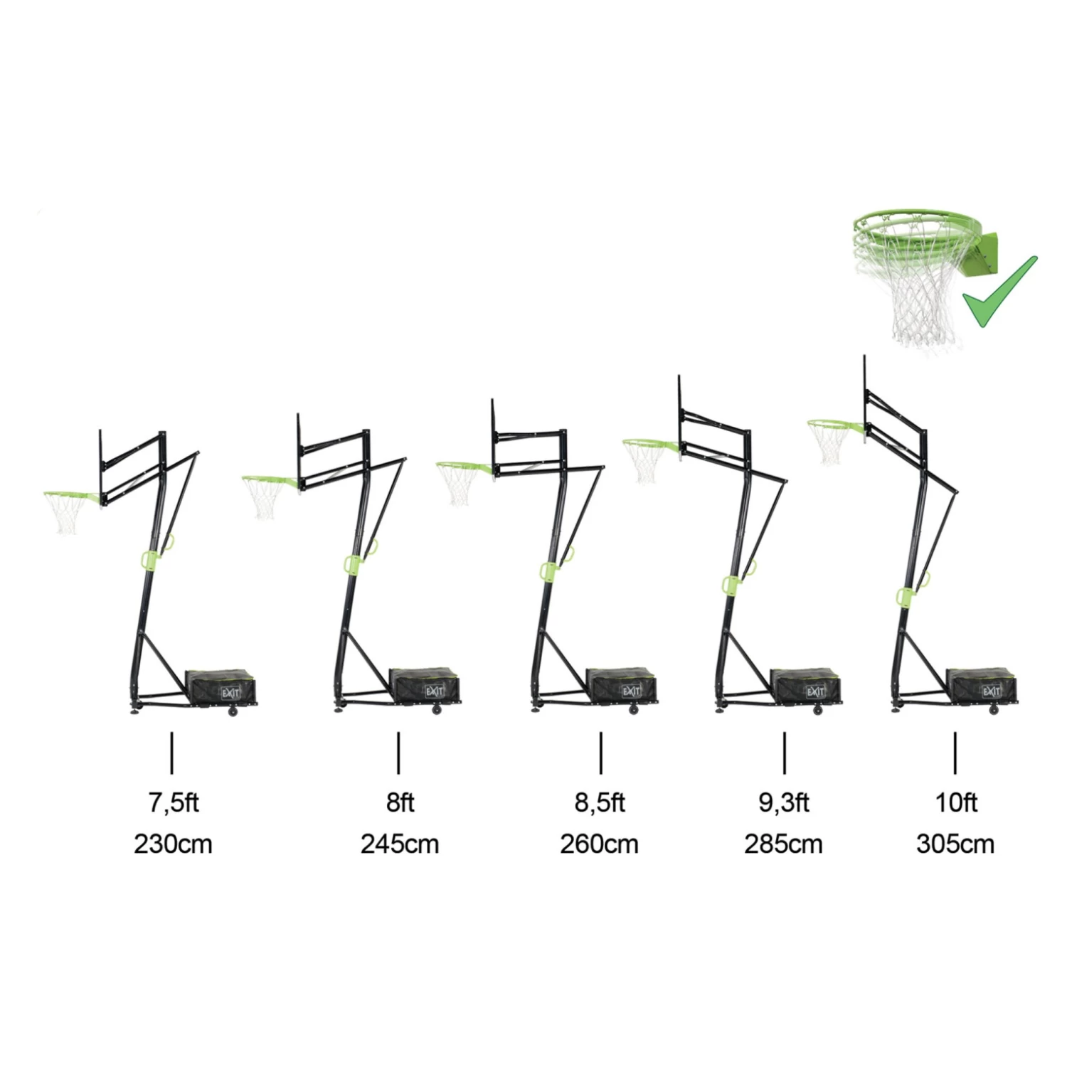 Het EXIT Galaxy basketbalbord kan in vijf verschillende standen worden versteld (230 – 245 – 260 – 285 – 305 cm). De basketbalsystemen van EXIT Toys zijn robuust en gemaakt van hoogwaardige materialen voor een lange levensduur.