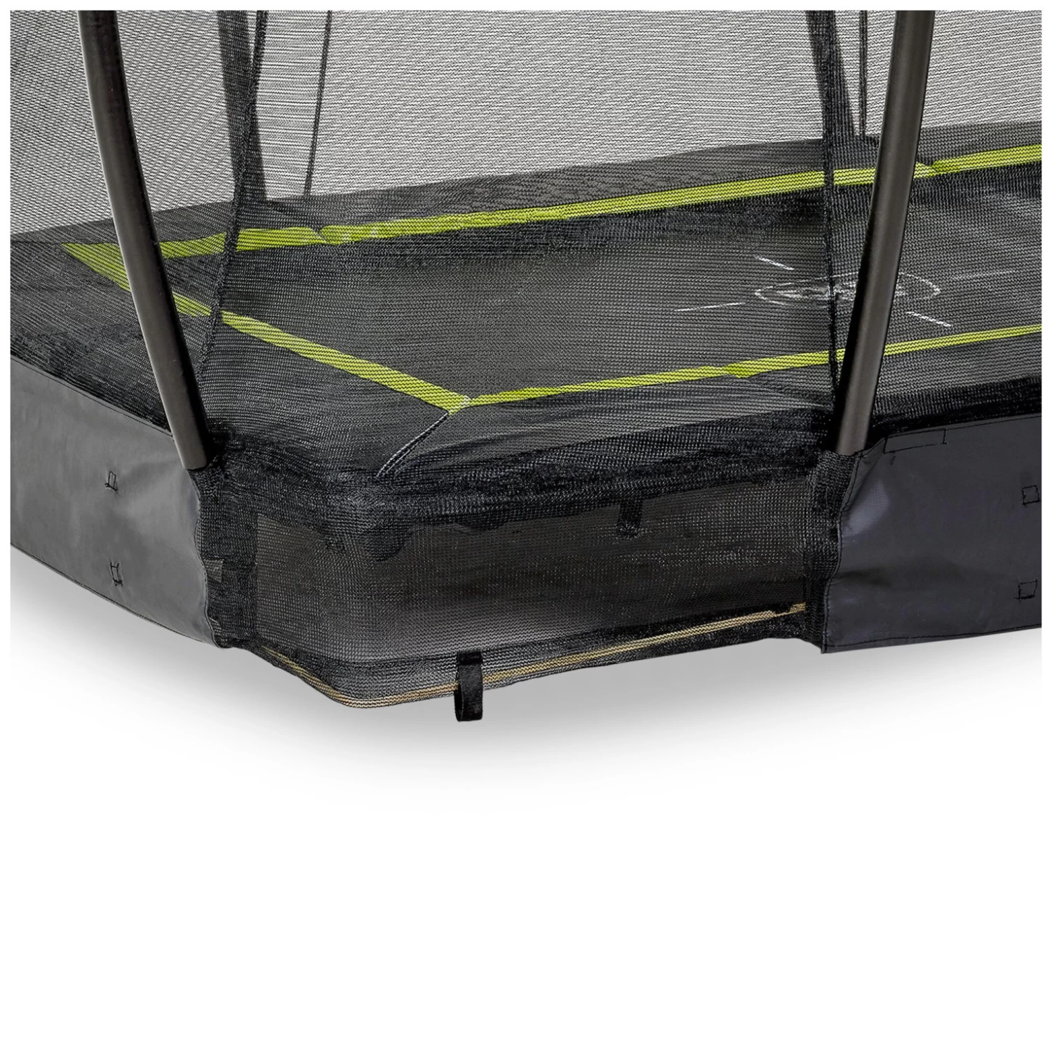 De EXIT Silhouette inground trampoline is een rechthoekige trampoline. Het veiligheidsnet, dat wordt meegeleverd met deze trampoline, is voorzien van gebogen staanders zodat het net strakgespannen staat. De hoogwaardige beschermrand dekt de gegalvaniseerde veren volledig af en is voorzien van een speciaal ontwikkeld voetbeschermingssysteem, zodat je voet niet tussen de veren kan komen. De stevige veren staan garant voor goede sprongkracht. Het frame van de Silhouette trampoline is gegalvaniseerd en gepoedercoat zodat roest geen kans maakt. Op de rechthoekige EXIT Silhouette trampolines beleef je eindeloos veel springplezier!