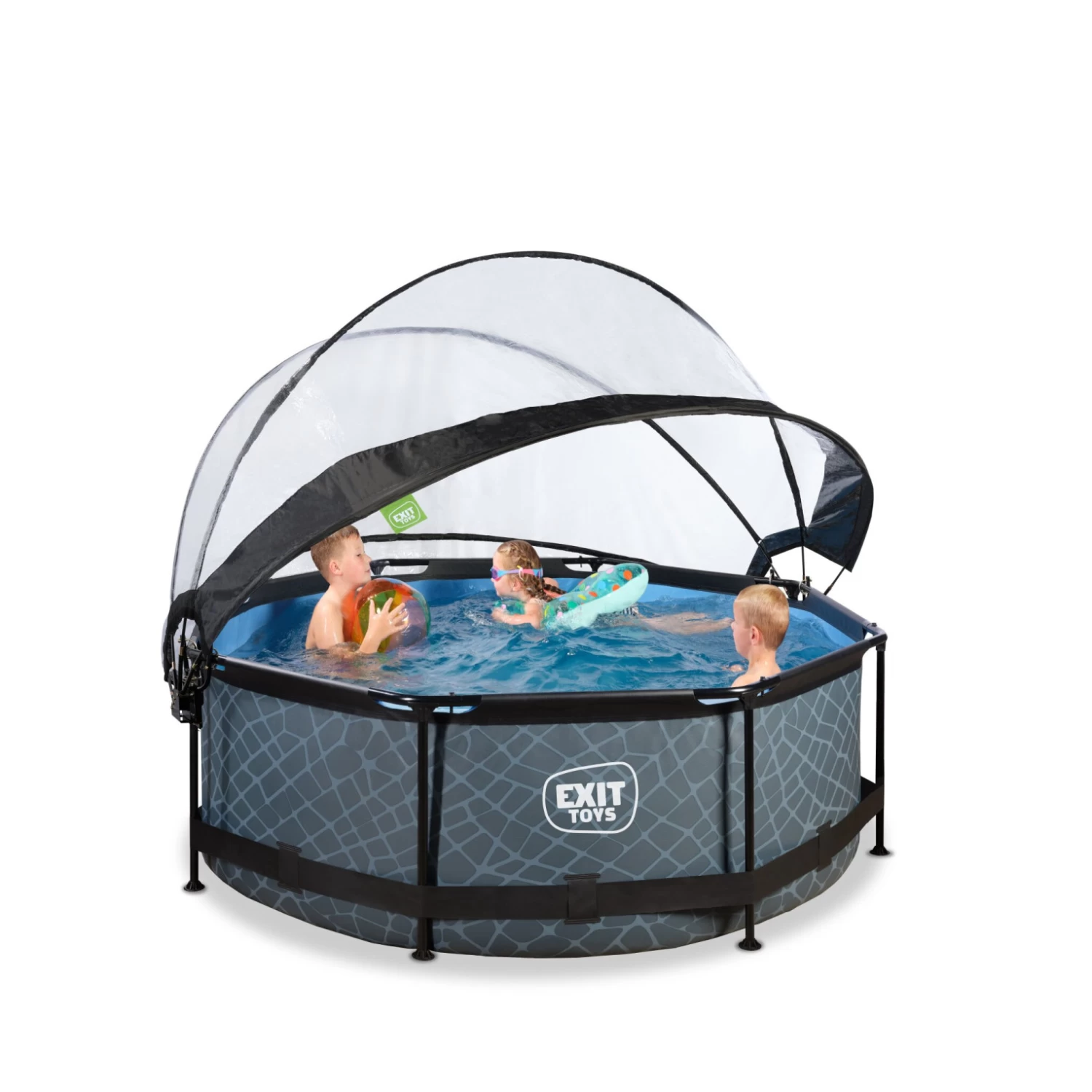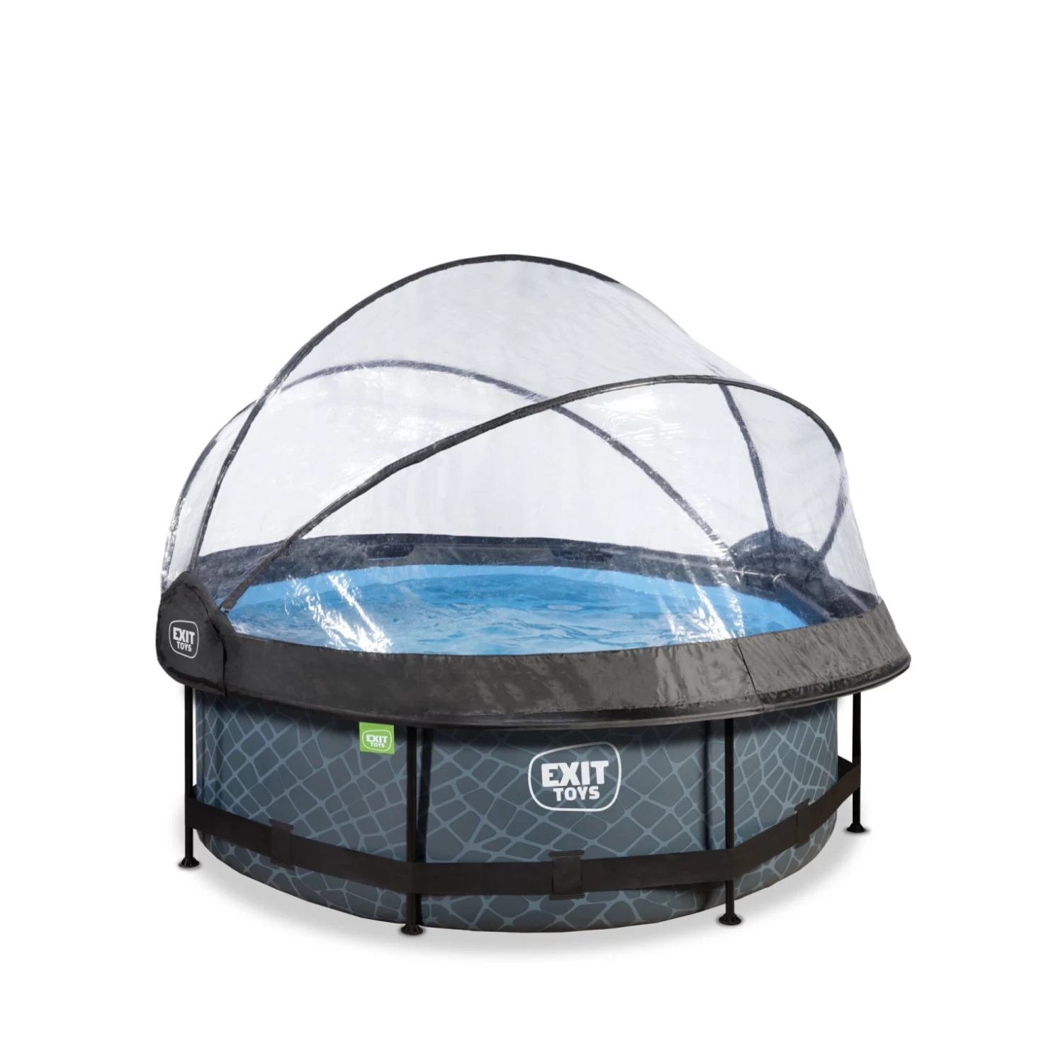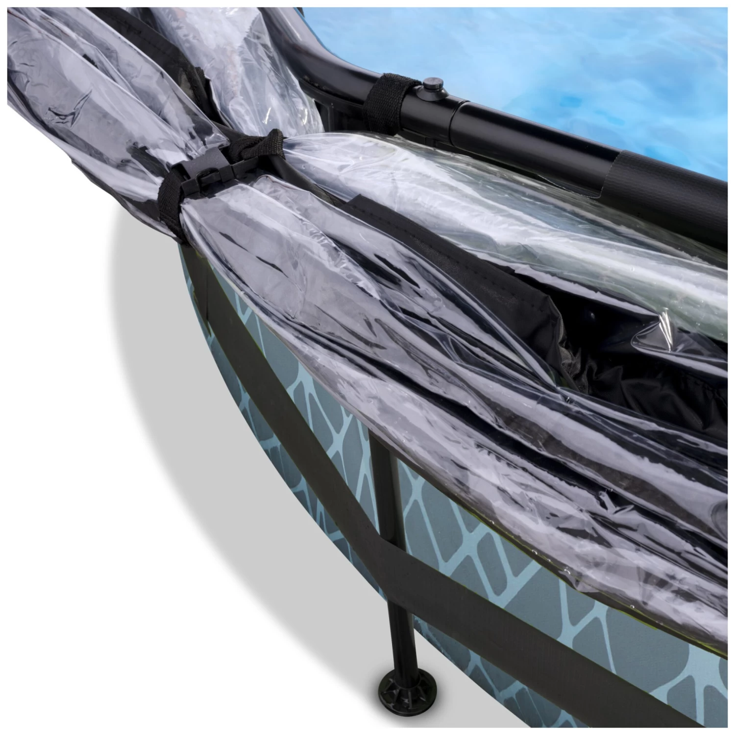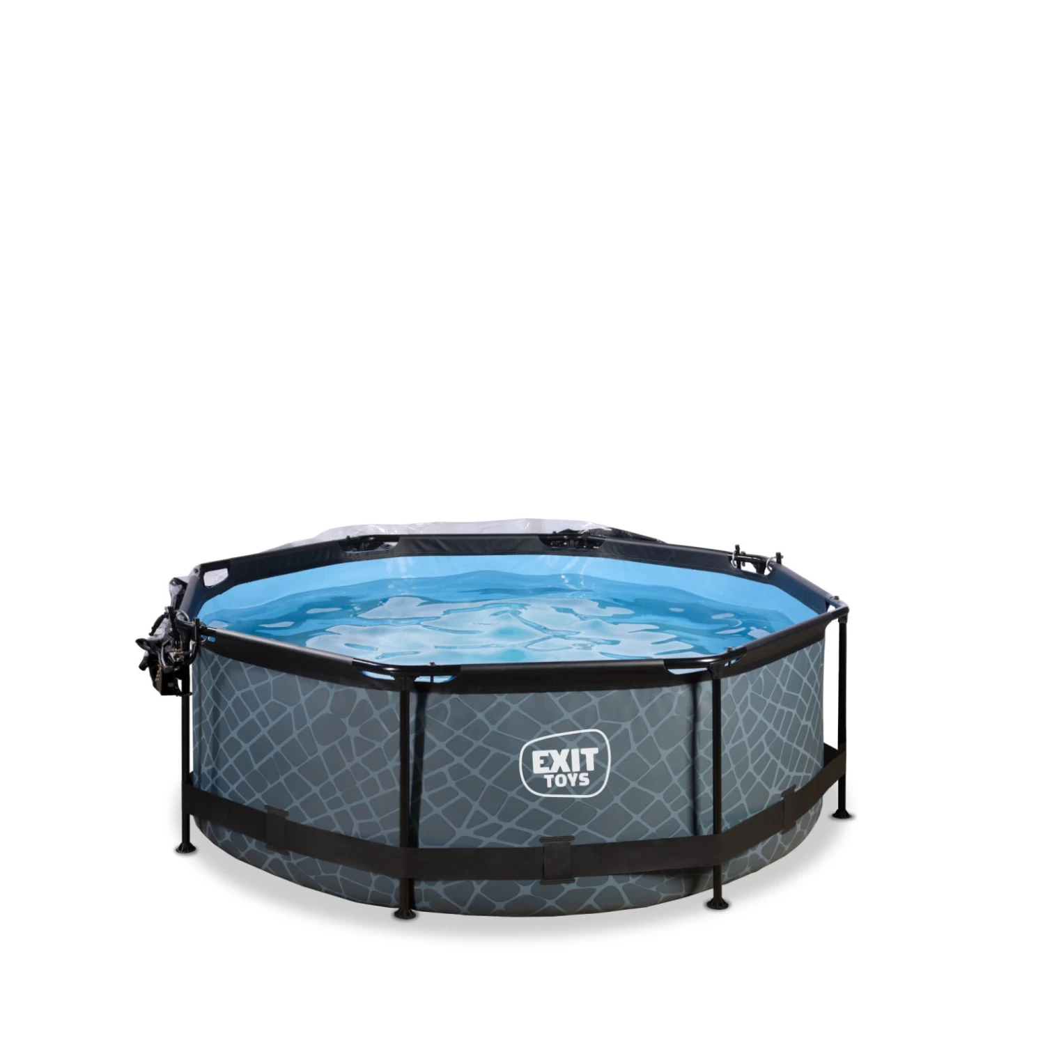 Het EXIT Stone zwembad ø244x76cm is een rond grijskleurig frame zwembad met overkapping. Het compacte zwembad is standaard voorzien van een filterpomp en valt op tussen andere zwembaden door zijn stoere steenpatroon. Ontdek hoe stevig een rond opzetzwembad kan zijn: het gepoedercoate stalen frame en de sterke poten van het EXIT Stone zwembad zorgen ervoor dat het bad altijd stabiel staat en jarenlang meegaat. De meegeleverde filterpomp houdt het water schoon en in beweging zodat vervuiling van het water wordt tegengegaan.