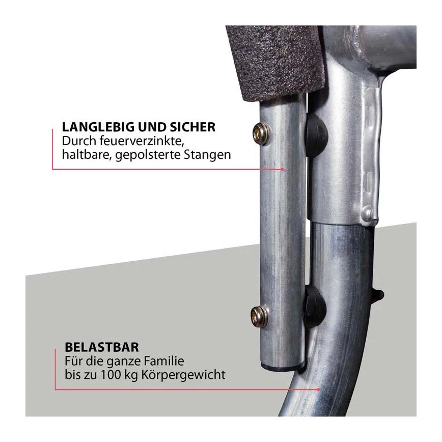 Bij deze tuintrampoline zegt de naam het al. Het innovatieve ontwerp is gewoonweg fantastisch. Smaakvol en discreet, het creëert de perfecte sfeer voor stijlvol springplezier zonder in te boeten aan functionaliteit. De speciale constructie van het veiligheidshek is dubbel overtuigend. De grote afstand tot de palen vergroot de veiligheid en dankzij het centrale net is het springoppervlak zeer ruim. De slijtvaste springmat van hoogwaardige stof, gefixeerd in 48 veren, garandeert een zeer goede sprongversnelling. De extra brede en dikke randafdekking van zeildoek is scheurvast en versterkt met nylon. De stabiele dubbele poten zorgen altijd voor een veilige stand.De trampoline heeft een maximaal draagvermogen van 100 kg. Aantal veren: 48, Dikte framekussen ca. 2,5 centimeter. Hoogte (met net): 3,4 meter en doorsnede is 250 centimeter.