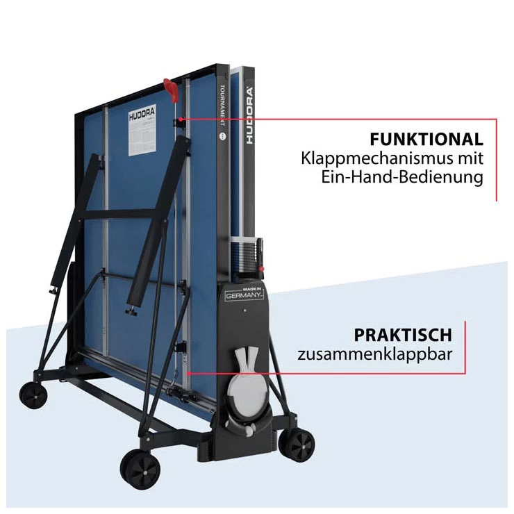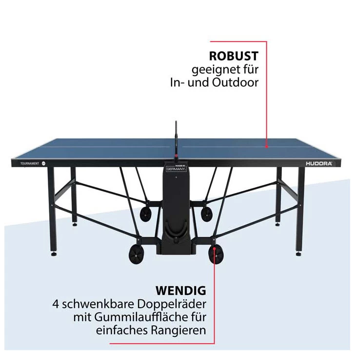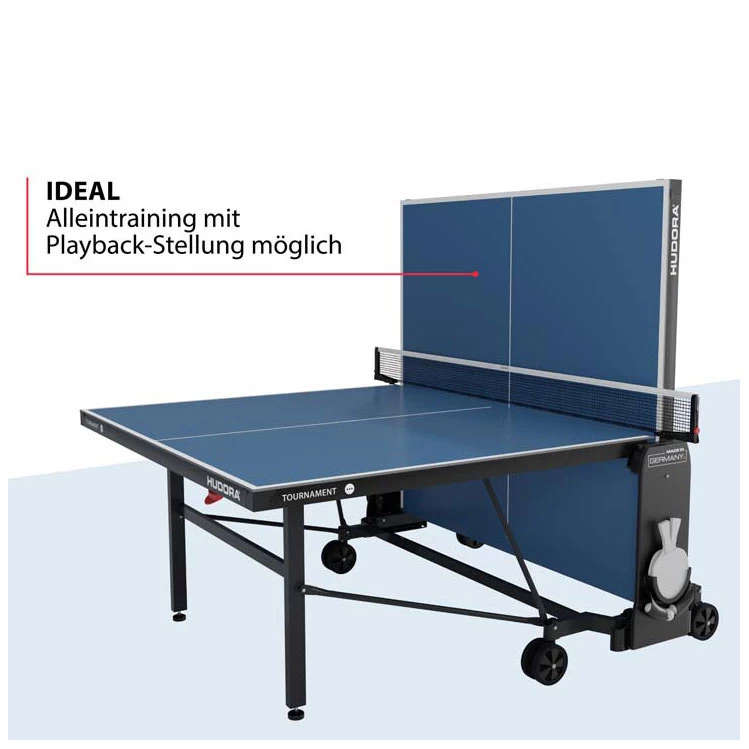 Smash en backhandflip? Het topmodel TOURNAMENT is hiervoor het perfecte platform. Ontworpen voor de hoge eisen van ervaren fanatieke spelers: kwaliteit, functies, speeleigenschappen… alles is perfect voor deze professionele tafeltennistafel. Terwijl de 6 mm dikke melamineharsplaat voor meesterlijke balstuiters zorgt, laat de gepoedercoate basis niets te wensen over op het gebied van stabiliteit. Ook solotraining is mogelijk op deze hoogwaardige tafel; klap de ene helft van de tafel omhoog en vervang zo je tegenstander… door jezelf!