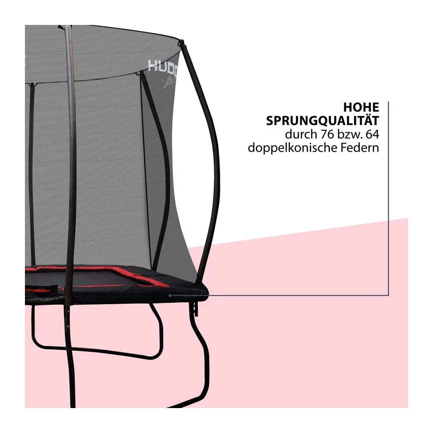 HUDORA Trampoline Rechthoek. Bijna zoals de profs: rechthoekige trampolines zijn een standaard in wedstrijdsporten omdat ze langs een lijn dezelfde springkwaliteit bieden. Op de 4square-trampoline kunnen kinderen en jongeren voor het eerst kennismaken met dit springgevoel – gekatapulteerd door de prestatievering met 76 dubbelconische stalen veren (64 voor de kleine versie) en twaalf Rapid Bounds (zes voor de kleine versie). Het high-impact frame met uitbestede veerbevestigingen op de centrale framebuizen zorgt voor een ideale krachtopname en beschermt de hoofdstaven. De brede voeten, het buitennet met topring en de tweekleurige randafdekking beloven veilig, GS-gecertificeerd springplezier voor gebruikers met een gewicht tot 120 kg.