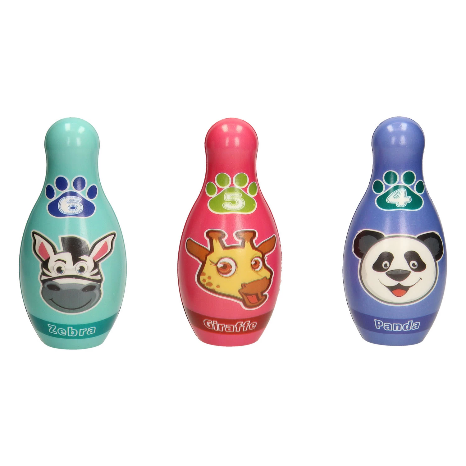 Deze bowlingset maakt bowlen nog veel leuker! Op de gekleurde kegels staan afbeeldingen van verschillende dieren, zoals een zebra, aap, tijger, hond, panda en giraffe. De bowlingballen zijn roze en blauw, met een afbeelding van een pootafdruk erop. De gehele set is gemaakt van foam, waardoor je dit leuke spelletje gewoon thuis in de huiskamer kunt spelen! De kegels zijn 16 centimeter hoog met een doorsnede van 6 centimeter en de bowlingballen hebben een doorsnede van 6 centimeter. Geschikt voor kinderen van 3 tot 6 jaar oud.