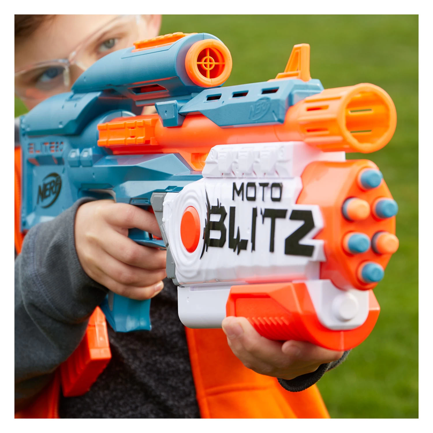 Schiet met krachtige airblitz-actie of gemotoriseerde kracht! Met de Nerf Elite 2.0 Motoblitz-blaster kun je op 2 manieren vuren, wat je flexibiliteit en tactisch voordeel geeft in Nerf-gevechten. Schiet 6 darts tegelijk af met airblitz, aangedreven door luchtdrukpompactie. Pomp de hendel naar achteren en voren en druk op de airblitz-knop om een zwerm van 6 darts af te schieten. Schiet gemotoriseerd snel 10 darts na elkaar af om tegenstanders te snel af te zijn. Plaats het magazijn met 10 darts in de blaster en je kunt meteen van start als je de motor inschakelt en de trekker overhaalt. Bij deze 2-in-1 blaster horen 22 Nerf Elite-darts om beide blastermodi te vullen. Gebruik het geïntegreerde vizier om nauwkeuriger te richten. Met de tactische rails kun je de blaster aanpassen met Nerf-accessoires. Het dragen van een bril wordt aangeraden (niet inbegrepen). Accessoires zijn afzonderlijk verkrijgbaar, zolang de voorraad strekt. Werkt op 4 AA-alkalinebatterijen van 1,5 V (niet inbegrepen). Nerf en alle bijbehorende eigenschappen zijn handelsmerken van Hasbro.