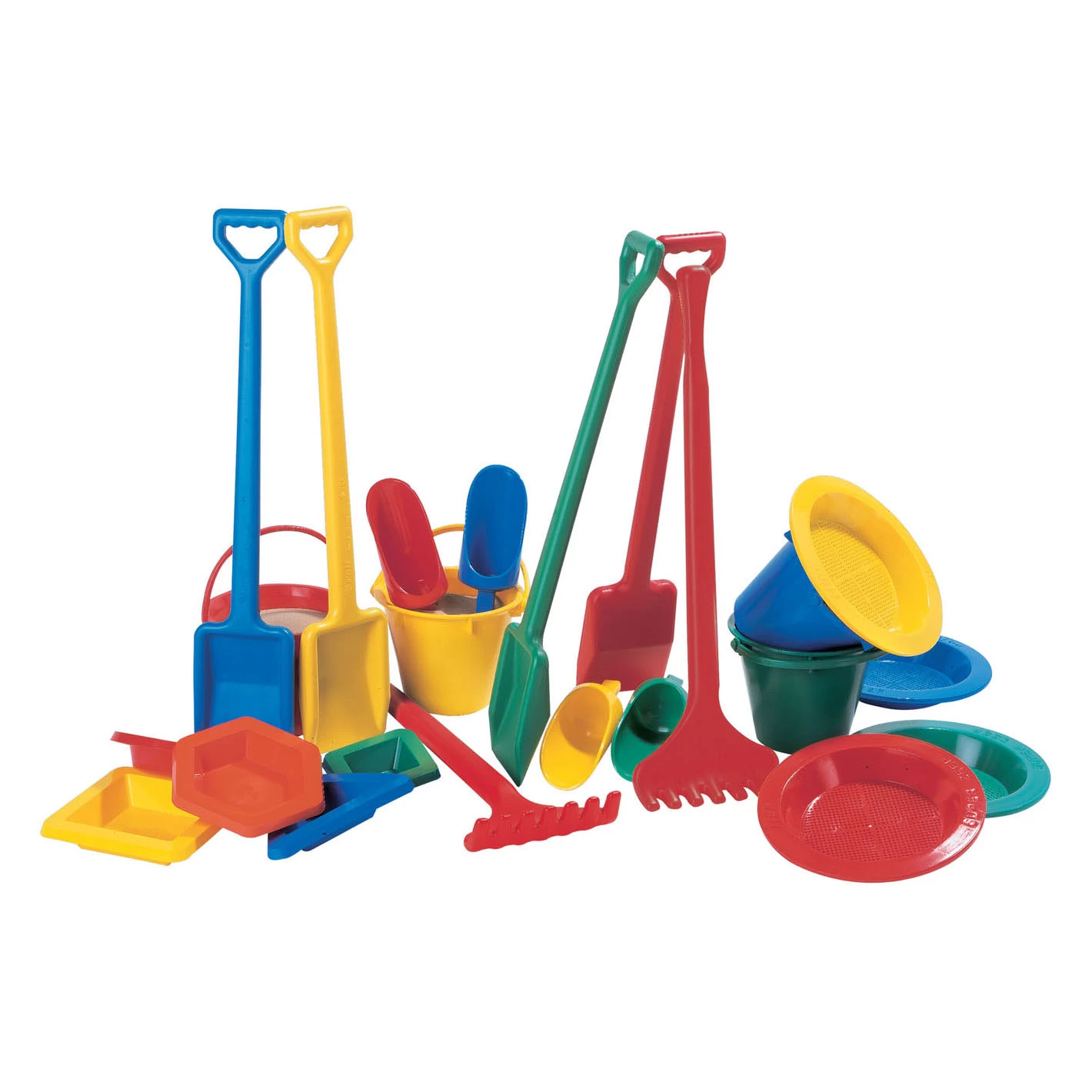 Met deze stevige, 23-delige zandbakset kun je eindeloos in het zand spelen. Heerlijk om te doen en daarbij ook nog eens goed voor de grove motoriek en, bij samenspel, goed voor de sociale vaardigheden. Jonge kinderen houden ervan om met zand te spelen. Vooral in combinatie met water. Ze komen erdoor tot rust en leren er veel van. Deze 23-delige set biedt alles wat je nodig hebt in de zandbak: scheppen, harken, vormpjes, emmers en zeven.