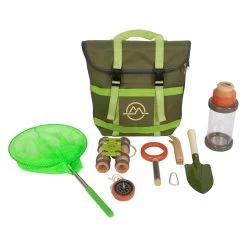 • Incl. insectenpot met schroefdeksel en geïntegreerd vergrootglas, houten verrekijker, insectennet met telescoopstok, kompas met draagkoord, vergrootglas met vergrotingsfunctie, pincet, schep en veerhaak.