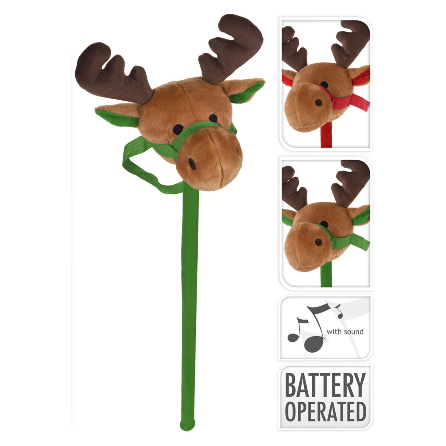 Ga jij de Kerstman helpen met cadeautjes onder alle kerstbomen leggen? Dan heb je ook een rendier nodig! Dit rendier stokpaard brengt je op alle plekken waar je wilt komen. Met zijn rode of groene teugels, kun je goed grip houden op het stokrendier. Deze rendieren maken ook nog gezellige geluiden tijdens de rit, dit werkt op batterijen.