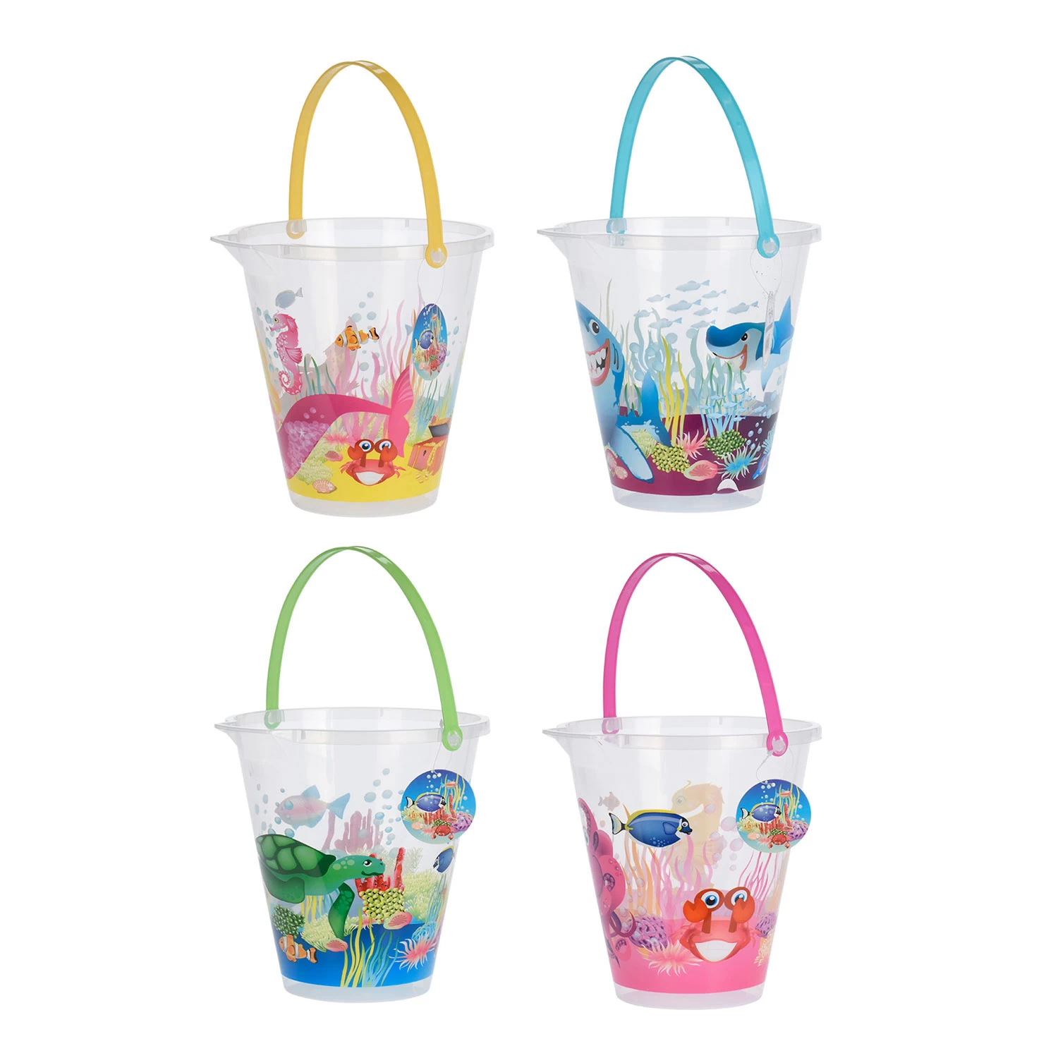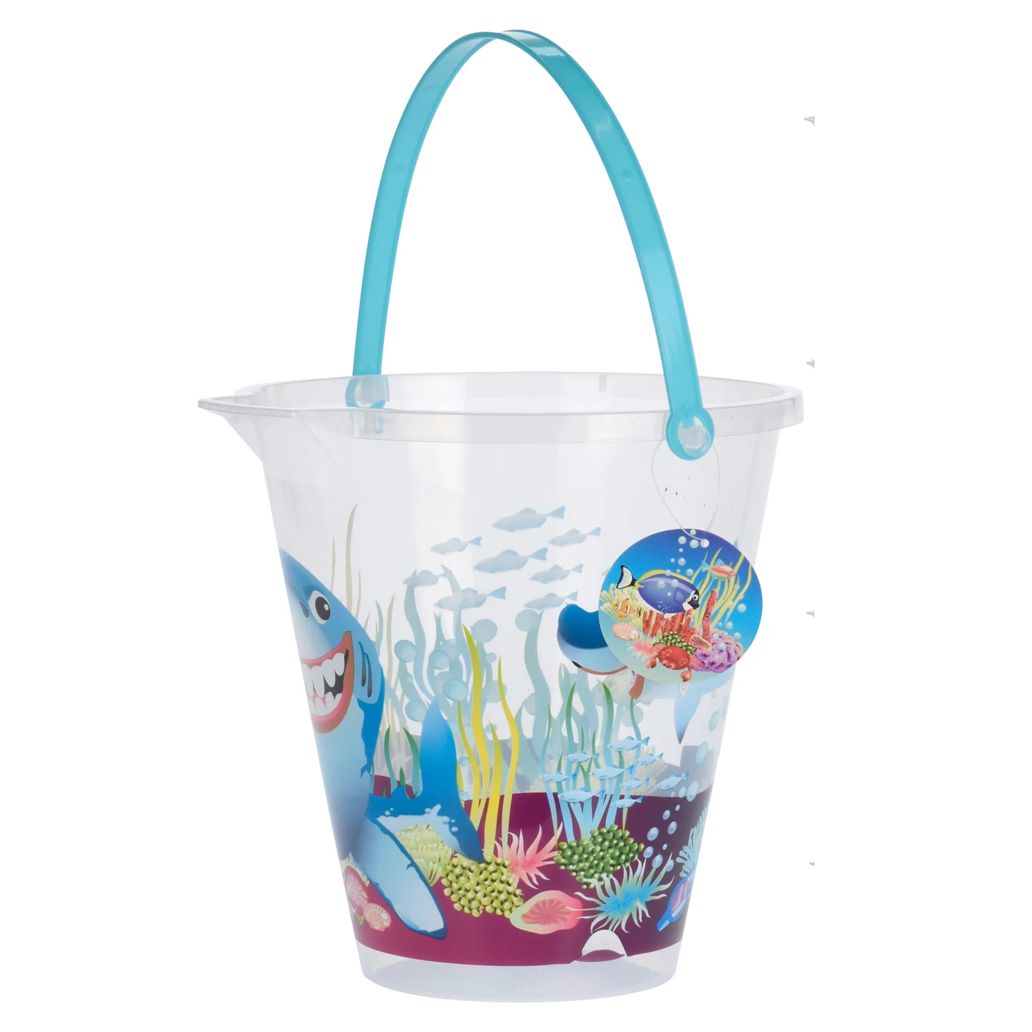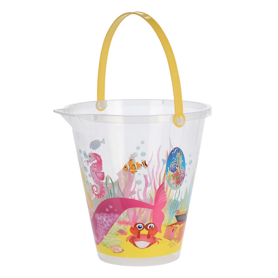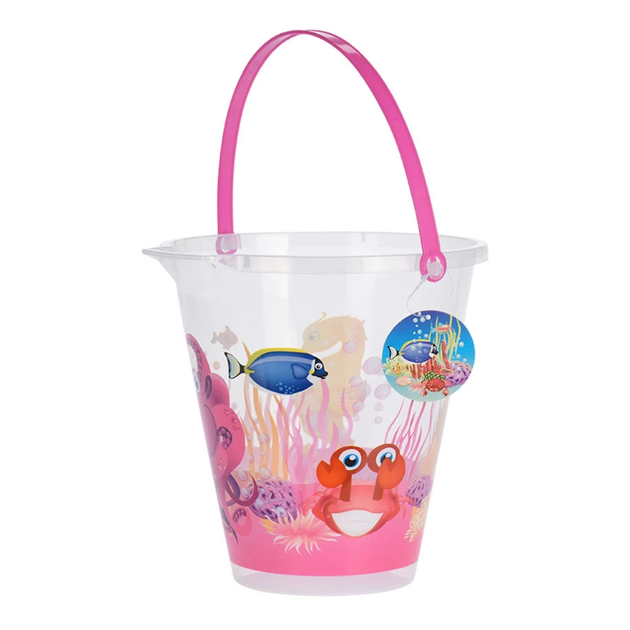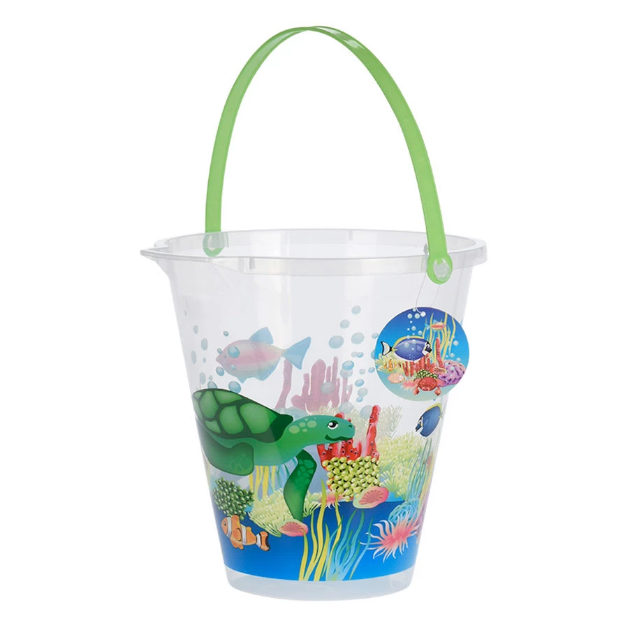 Verplaats water of zand met deze vrolijke strandemmer. De transparante emmer heeft een print van de onderwaterwereld rondom en een felgekleurd handvat. Dankzij de schenktuit aan de rand giet je het water of het zand gemakkelijk weer uit de emmer.