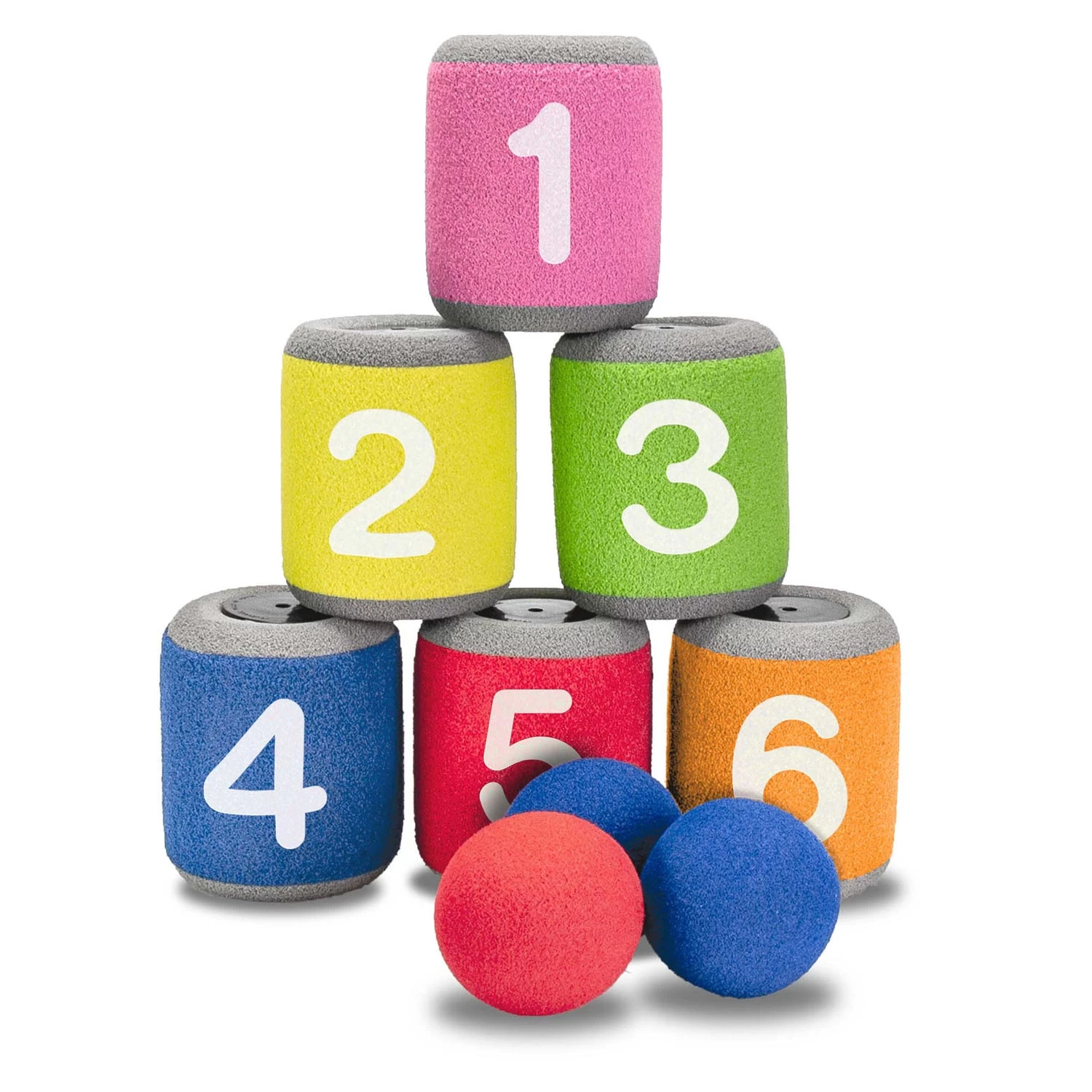 Stapel de blikjes op tot een piramide en ontdek wie het beste kan mikken! Het zachte materiaal is geschikt voor binnen en buiten.