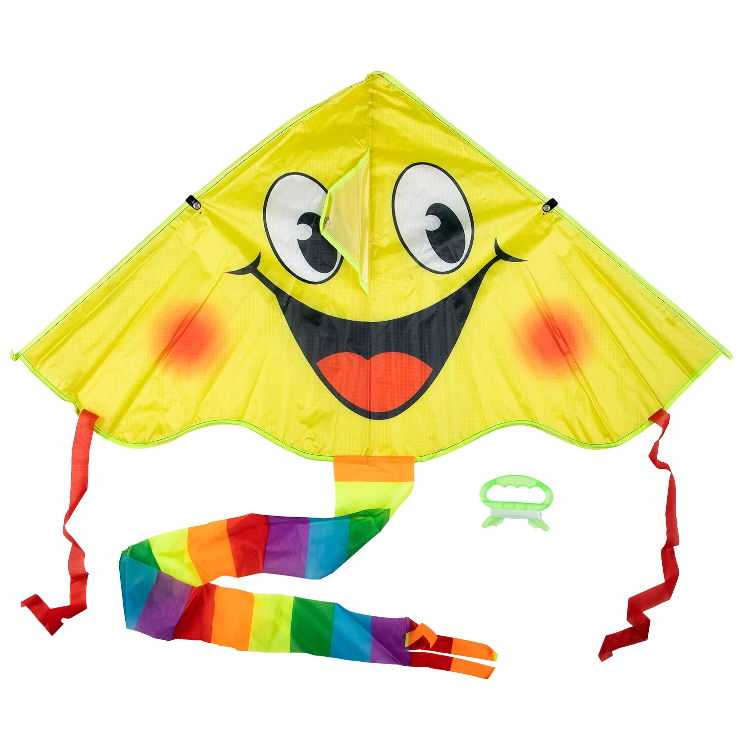 Laat deze vrolijke Lach vlieger opstijgen in de wind en zie hem zweven in de lucht. Inclusief klosje en vliegertouw. Let op: je moet het handvat nog even stevig aan het touw knopen zodat de vlieger er niet vandoor gaat!