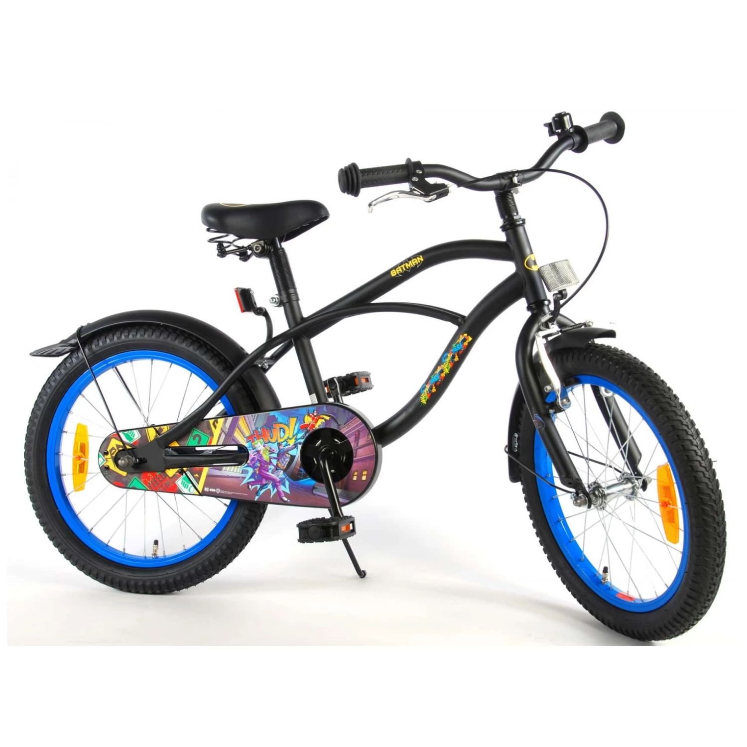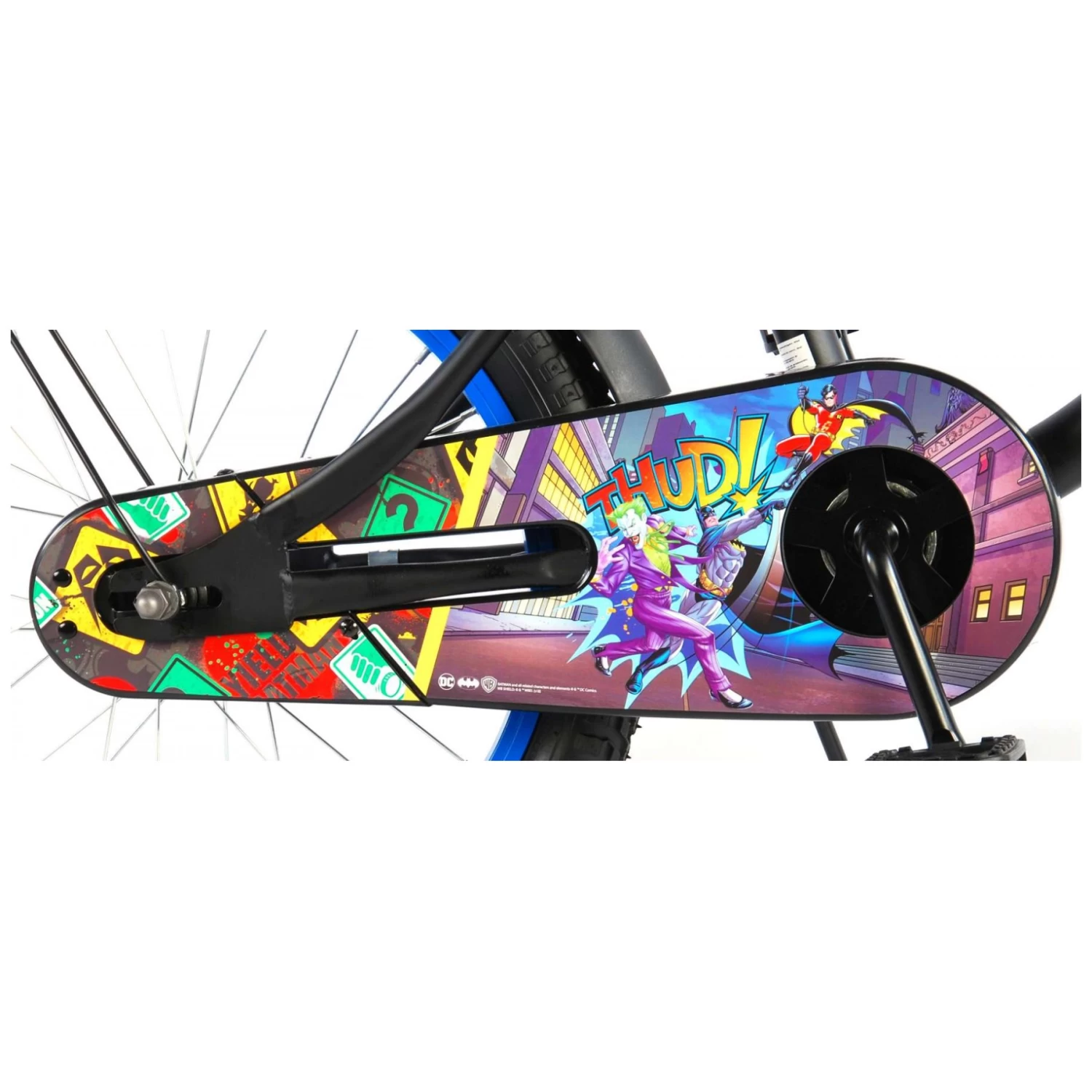 Deze kinderfiets Batman 18 inch jongensfiets is 85% afgemonteerd. Speciaal voor alle fans van deze superheld heeft Volare een fiets ontworpen in de stijl van Batman. De fiets heeft een stoer zwart frame met Batmanstickers. De kettingkast is volledig gesloten en heeft bovendien ook een stoere print. Om snel te kunnen leren fietsen heeft de fiets zijwieltjes. Verder heeft de fiets een fietsbel en zowel een hand- als een terugtraprem.