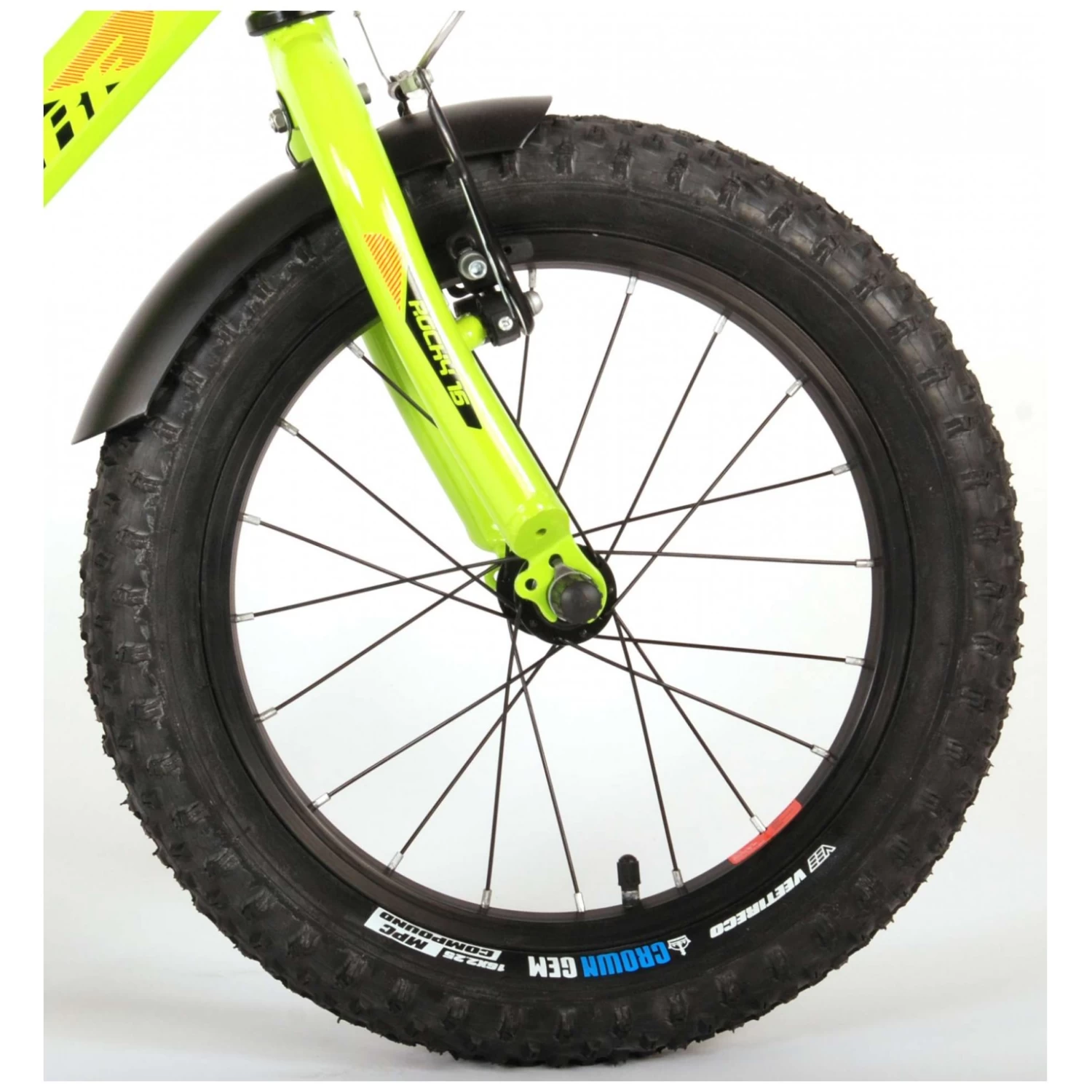 Volare Rocky 16 inch kinderfiets 95% afgemonteerd. De Volare Rocky kinderfietsrange is van superieure kwaliteit. De 16 inch Rocky is een stoere jongensfiets met extra brede banden, waar ieder kinderhart sneller van gaat kloppen. Ook de spatborden zijn extra groot en mooi gevormd waardoor zij al het opspattende vuil tegenhouden. Om vaart te kunnen minderen heeft de fiets een veilig remsysteem met een stevige aluminium V-brake. Daarnaast heeft de fiets een aluminium smart conrtol systeem, dat ervoor zorgt dat het stuur begrensd is. De fiets heeft een gesloten kettingkast, stevig standaard en een fietsbel. Het geometrische frame in de groene kleur maakt van deze fiets een echte eyecatcher. Deze fiets is dé fiets om kinderen te inspireren om de wereld te gaan ontdekken. Bovendien is de fiets voor 95% afgemonteerd, dus bijna fietsklaar. Wel zo gemakkelijk!