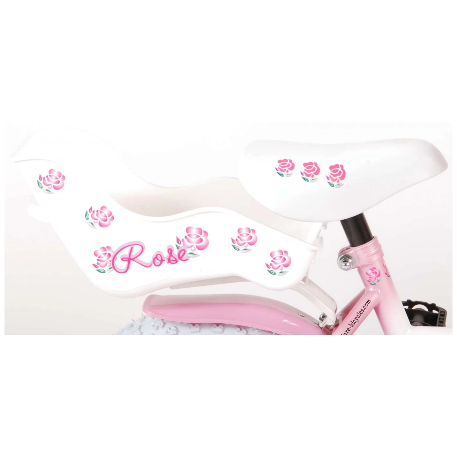 Volare Rose 12 inch meisjesfiets. Deze mooie Volare Rose fiets is een échte meisjesfiets. In prachtige kleurstelling roze met een meisjesachtig bloemetjesdecor. Deze fiets is met zijn afneembare zijwieltjes een ideale fiets om op te leren fietsen. De fiets is voorzien van een sterk en modern U-vormig frame, afneembare zijwieltjes, fietsbel en hand- en terugtraprem. Verder heeft de fiets een poppenzitje zodat zij haar poppen overal mee naar toe kan nemen, maar tegelijkertijd haar handjes veilig aan het stuur kan houden. LET OP: NU MET WITTE BANDEN. Welk meisje wil deze fiets nu niet? Deze fiets is voor 95% afgemonteerd, dus bijna fietsklaar. Wel zo gemakkelijk!